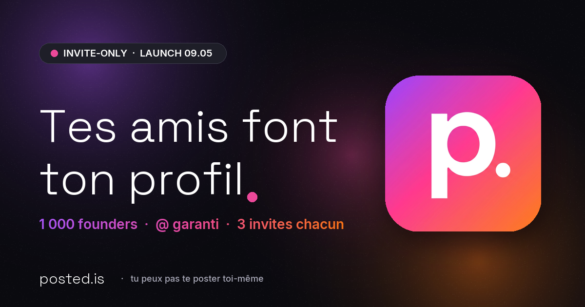 posted est une app sociale où tes amis construisent ton profil à ta place. Caméra frontale bloquée, pas de filtres, pas de selfies. Lancement le 9 mai 2026 — les 1 000 premiers inscrits gardent leur @ à vie.